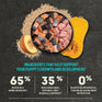 Raw salmon (19%), herring meal (18%), oat groats, whole sorghum, pork fat (11%), whole millet, pork meal (5%), pollock meal (5%), whole oats, raw pork (4%), pork liver (3%), ground miscanthus grass, salt, dried kelp, potassium chloride, fresh whole pumpkin, fresh whole butternut squash, fresh whole apples, fresh whole carrots, fresh whole pears, fresh whole zucchini, fresh kale, fresh spinach, fresh turnip greens, fresh beet greens, whole cranberries, whole blueberries, whole saskatoon berries, dried chicory root, burdock root, lavender, marshmallow root, milk thistle, rosehips, turmeric root