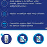 • Keep diffuser plugged in continuously and replace refills every 30 days