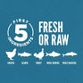 - The first 5 ingredients are fresh or raw poultry and fish ingredients. Our fresh ingredients use refrigeration as the sole method of preservation and our raw ingredients are frozen at their peak freshness.