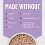 - Made without - grain, potato, corn, wheat, soy, by-product meal, artificial colors or preservatives