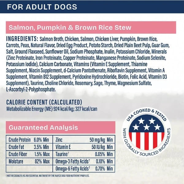 NUTRITIONAL STATEMENT: Natural Balance Health Protection Salmon Broth, Salmon, Pumpkin & Brown Rice Stew is formulated to meet the nutritional levels established by the AAFCO Dog Food Nutrient Profiles for maintenance.