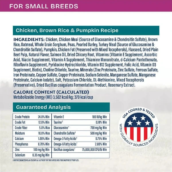 Chicken, Chicken Meal (Source of Glucosamine & Chondroitin Sulfate), Brown Rice, Oatmeal, Whole Grain Sorghum, Peas, Pearled Barley, Turkey Meal (Source of Glucosamine & Chondroitin Sulfate), Pumpkin, Chicken Fat (Preserved with Mixed Tocopherols), Flaxseed, Dried Plain Beet Pulp, Natural Flavor, Salmon Oil, Dried Chicory Root, Vitamins (Vitamin E Supplement, Ascorbic Acid, Niacin Supplement, Vitamin A Supplement, Thiamine Mononitrate, d-Calcium Pantothenate, Riboflavin Supplement, Pyridoxine Hydrochloride, Vitamin B12 Supplement, Folic Acid, Vitamin D3 Supplement, Biotin), Choline Chloride, Taurine, Minerals (Zinc Proteinate, Zinc Sulfate, Ferrous Sulfate, Iron Proteinate, Copper Sulfate, Copper Proteinate, Sodium Selenite, Manganese Sulfate, Manganese Proteinate, Calcium Iodate), Salt, Potassium Chloride, DL-Methionine, Mixed Tocopherols (Preservative), DriedBacillus coagulansFermentation Product, Rosemary Extract