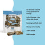 Our 100% natural and edible Icelandic Cod Skin Fish Pieces are single ingredient and contain no additives, preservatives or supplements. They come only from the pure icy waters of Iceland and are line-caught daily and processed immediately. Not only are they delicious for your dog, they reduce tartar and plaque build-up for healthier gums and teeth. They are also a great natural source of Omega-3 & Omega-6 fatty acids, promoting healthy skin and coat for your pet. With just one ingredient, these tasty and healthy treats are perfect for dogs with protein sensitivities. Our natural and edible fish products offer peace of mind, as they are cleaned and air-dried within FDA, USDA, EU, and MAST standards and regulations. Because Iceland almost never gets warm, our fish always remain cold after being caught. As a result, they have less smell than other fish treats in the market.
