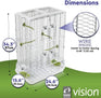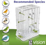 Vision bird homes have many revolutionary design features that set it apart from traditional bird cages. Vision's unique no-drawer design simplifies cage cleaning-simply detach the cage portion and empty the contents of the base into the waste bin. Vision's deep base can handle multiple types of litter, while raised ridges inside the base provide air circulation and help prevent mildew. The bird homes also allow non-invasive, exterior access to seed/water cups, reducing stress to birds during maintenance. In addition, multi-grip perches promote circulation and help prevent foot problems. The knock-down cages are easy to assemble with a five minute quick, click-snap assembly.