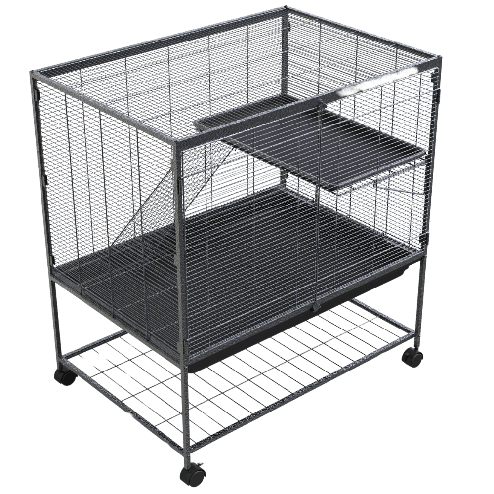 The "Sharon" multi-level cage features small horizontal bar spacing, designed to facilitate easy climbing and exploration while preventing escapes. An integrated, convenient storage shelf underneath the main enclosure offers practical space to keep all of your pet's essentials, such as food, bedding, and toys, neatly organized
