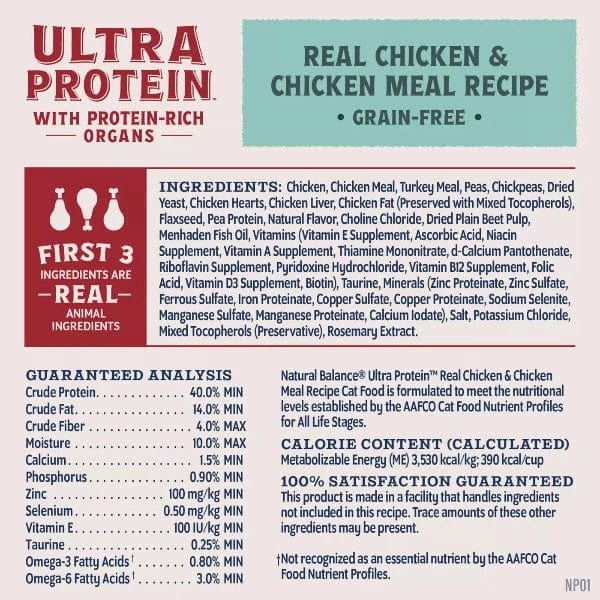 Natural Balance Ultra Protein Real Chicken & Chicken Meal Recipe is formulated specifically for cats with our veterinary and nutrition experts to maximize protein, taste and nutrition for even the pickiest eaters. Each delicious bite of this chicken cat food is made with protein-rich organs for cats, like chicken liver & chicken hearts, and is complete and balanced to give your cat the energy and taste they crave.