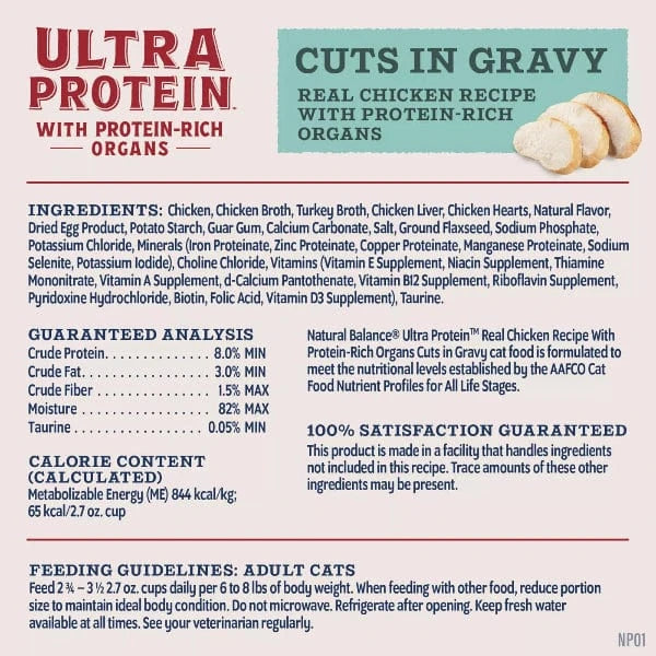 Natural Balance Ultra Protein Wet Cat Food Cuts in Gravy Real Chicken with Protein-Rich Organs Recipe is formulated specifically for cats with our veterinary and nutrition experts to maximize protein, taste and nutrition for even the pickiest eaters. This high protein food for cats is one of the best wet cat foods for picky cats. Each delicious bite of this chicken cat food is made with protein-rich organs for cats and is complete and balanced to give your cat the energy and taste they crave.