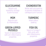 - Methylsulfonylmethane (MSM): Known for its ability to reduce pain and improve joint mobility.