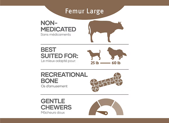 - Beef femurs include variable amounts of meat, connective tissue, and generous amounts of marrow (fat).