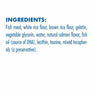 Fish meal, white rice flour, brown rice flour, gelatin, vegetable glycerin, water, natural salmon flavour, fish oil (source of DHA), lecithin, taurine, mixed tocopherols (a preservative).