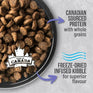 Deboned chicken, chicken meal, red lentils, pearled barley, steel cut oats, green peas, chicken fat (preserved with mixed tocopherols), sun-cured alfalfa meal, natural chicken flavour, freeze-dried chicken liver, salmon oil, coconut oil, pumpkin, butternut squash, carrots, broccoli, spinach, pomegranate, apples, cranberries, blueberries, juniper berry extract, ginger, fennel, chamomile, peppermint leaf, licorice root, turmeric, vitamins (vitamin E supplement, vitamin A supplement, niacin, calcium pantothenate, riboflavin, pyridoxine hydrochloride, thiamine mononitrate, biotin, vitamin B12 supplement, vitamin D3 supplement, folic acid), minerals (zinc sulfate, zinc proteinate, iron proteinate, ferrous sulfate, copper proteinate, copper sulfate, manganese proteinate, manganous oxide, calcium iodate, sodium selenite), lecithin, salt, choline chloride, potassium chloride, chicory root extract, yeast extract, calcium carbonate, DL-methionine, L-lysine, taurine, glucosamine hydrochloride, chondroitin sulfate, rosemary extract, L-carnitine, dried Lactobacillus acidophilus fermentation product, dried Lactobacillus casei fermentation product, dried Bifidobacterium bifidum fermentation product, dried Enterococcus faecium fermentation product.