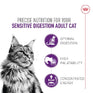 Three distinct kibble shapes are combined with exclusive aromas to appeal to a cat with a finicky appetite due to a sensitive digestive system. SENSITIVE DIGESTION is for cats from 1 to 7 years of age.