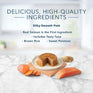 Salmon, Fish Broth, Chicken Liver, Chicken, Brown Rice, Natural Flavor, Guar Gum, Powdered Cellulose, Sweet Potatoes, Sodium Acid Pyrophosphate, Carrageenan, Taurine, Potassium Chloride, Cassia Gum, Salt, Choline Chloride, Magnesium Sulfate, Iron Amino Acid Chelate, Zinc Amino Acid Chelate, Vitamin E Supplement, Thiamine Mononitrate (Vitamin B1), Copper Amino Acid Chelate, Manganese Amino Acid Chelate, Sodium Selenite, Niacin Supplement (Vitamin B3), Calcium Pantothenate (Vitamin B5), Pyridoxine Hydrochloride (Vitamin B6), Riboflavin Supplement (Vitamin B2), Vitamin A Supplement, Biotin (Vitamin B7), Potassium Iodide, Vitamin D3 Supplement, Vitamin B12 Supplement, Folic Acid (Vitamin B9).