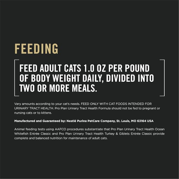 Animal feeding tests using AAFCO procedures substantiate that Pro Plan Urinary Tract Health Turkey & Giblets Entrée Classic provides complete and balanced nutrition for maintenance of adult cats. Animal feeding tests using AAFCO procedures substantiate that Pro Plan Urinary Tract Health Ocean Whitefish Entrée Classic provides complete and balanced nutrition for maintenance of adult cats.