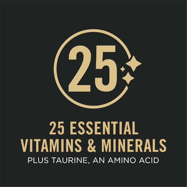 • 25 essential vitamins and minerals plus taurine, an amino acid