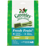One GREENIES Fresh Dental Treat is all it takes for clean teeth, fresh breath, and a happy dog. Your dog can't wait to sink their teeth into these delicious dental dog breath chews because they are bursting with breath-freshening mint flavour and feature a delightfully chewy texture that fights plaque and tartar. Irresistibly tasty and incredibly powerful, GREENIES Treats for Dogs are vet-recommended for at-home oral health care and accepted by the VOHC (Veterinary Oral Health Council.) Best of all, these natural dental treats are made with highly soluble ingredients that are safe and easy to digest. Give your dog the mouth-wowing breath freshener that helps promote their overall health with GREENIES Dog Treats. Natural Dog Treats Plus Vitamins, Minerals, and Other Nutrients.