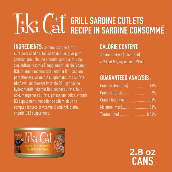 SPECIAL ORDER ITEM. May take an extra 5-8 business days for your order to leave our warehouse since we need to order the item. Online Only Item Tiki Cat Grill Sardine Cutlets Wet Cat Food.... Show Details