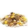Expanded maize (18%), kibbled carob, maize flakes, wheat, wheat feed, expanded wheat, sunflower seed, spelt hulls, alfalfa, wheat middlings, crushed maize, pea flakes, soya hulls, lucerne protein concentrate, wheat gluten feed, linseed, calcium magnesium carbonate, sodium chloride, toasted soya beans, refined coconut oil, fructo-oligosaccharides, soya meal, dried carrots, monocalcium phosphate, broken peas, turmeric