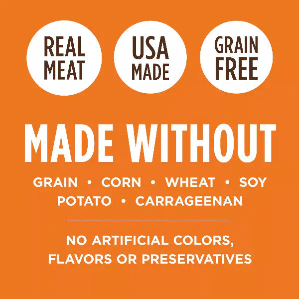 - Made without - grain, potato, corn, wheat, soy, by-product meal, artificial colors or preservatives