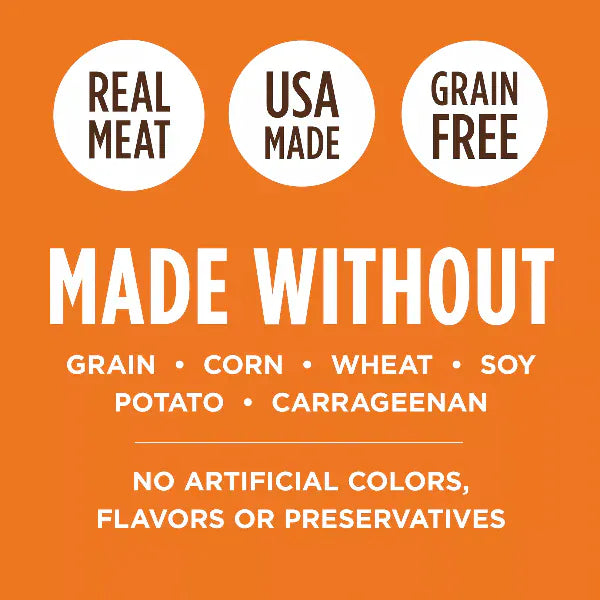 - Made without - grain, potato, corn, wheat, soy, by-product meal, artificial colors or preservatives