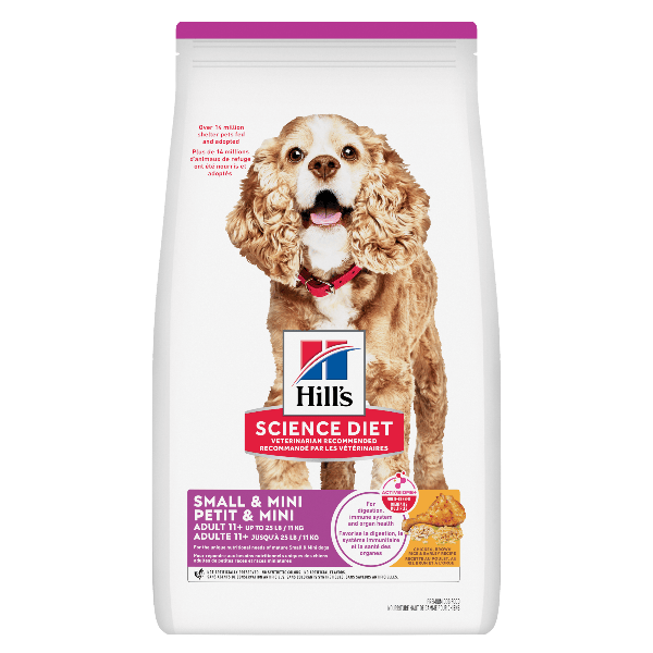 Big on Love, Small in Size. Hill's Science Diet Small & Mini Adult 11+ dry dog food is tailored nutrition to support healthy aging during Small & Mini dogs’ golden years. Specially made with nibble size kibble & contains prebiotic fiber for healthy digestion.