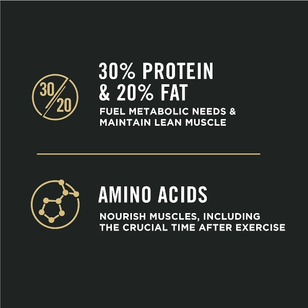 Help your dog excel with the fine-tuned nutrition of Purina Pro Plan Brand Dog Food PERFORMANCE 30/20 Chicken & Rice Formula dry dog food. Designed for highly active dogs, this dry dog food appeals to owners of sporting dogs, cattle dogs, hunting dogs and competitive canine athletes. The recipe concentrates nutrition in ways that help optimize oxygen metabolism for increased endurance. This formula contains a blend of 30% protein and 20% fat to assist in caring for your dog's metabolic needs and help him maintain lean, strong muscles. Amino acids nourish your dog's muscles, especially in those critical moments after your dog has been working or training hard. This delicious recipe features chicken as the first ingredient and provides your dog with the protein and nutrients he needs for his active lifestyle. EPA and glucosamine help support joint health and mobility. The tasty, antioxidant-rich recipe doesn't just fuel your dog's body; it also nourishes his immune system and helps defend it against free radicals. Provide your canine companion with 100% complete and balanced nutrition by giving him this dry dog food proudly manufactured in our own U.S. facilities, and allow him to achieve greatness.