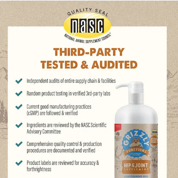 Grizzly Hip & Joint Supplement is specifically formulated with five active joint ingredients to maintain and support joint flexibility and mobility. It provides building blocks for synovial fluid, cartilage, and connective tissues to help maintain joint health. For use in dogs and cats.