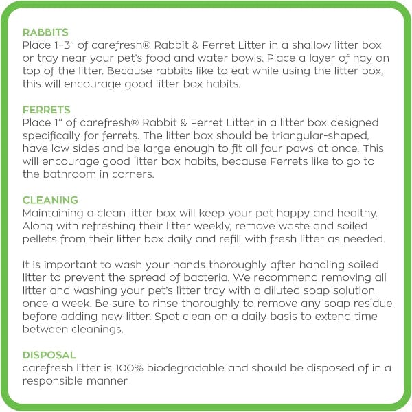 carefresh® rabbit & ferret litter with clean, white paper pellets is naturally lightweight and super absorbent. Rabbits and ferrets and even rats prefer to keep their home clean and tidy by using a defined litter box. Using an absorbent, odor controlling litter will keep their home clean and fresh longer and reduce the time spend cleaning up after them. Return the love by providing the very best care. Get some easy tips for litter training!