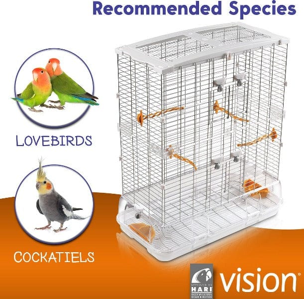 Vision bird homes have many revolutionary design features that set it apart from traditional bird cages. Vision's unique no-drawer design simplifies cage cleaning-simply detach the cage portion and empty the contents of the base into the waste bin. The deep base can handle multiple types of litter, while raised ridges inside the base provide air circulation and help prevent mildew. The bird home also allows non-invasive, exterior access to seed/water cups, reducing stress to birds during maintenance. In addition, multi-grip perches promote circulation and help prevent foot problems. The knock-down cages are easy to assemble with a five minute quick, click-snap assembly,
